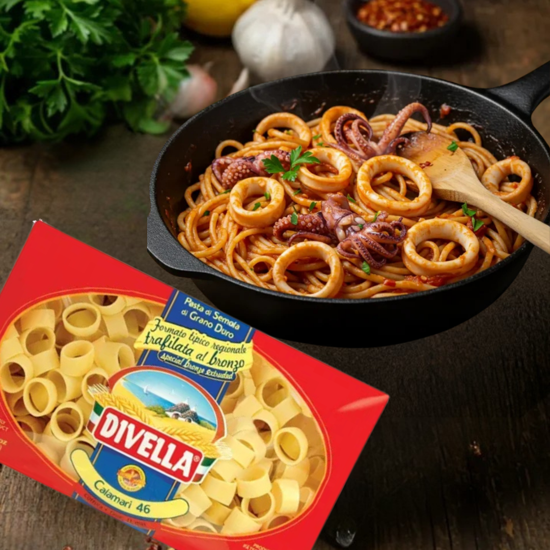 La pasta Calamari de Divella es un corte distintivo en forma de anillos inspirado en su homónimo, diseñado para aportar una experiencia visual y gastronómica diferente dentro de la cocina italiana. Su estructura hueca y de tamaño medio permite una excelente captación de salsas, favoreciendo platos con mayor integración de sabores y una textura equilibrada en cada bocado.
